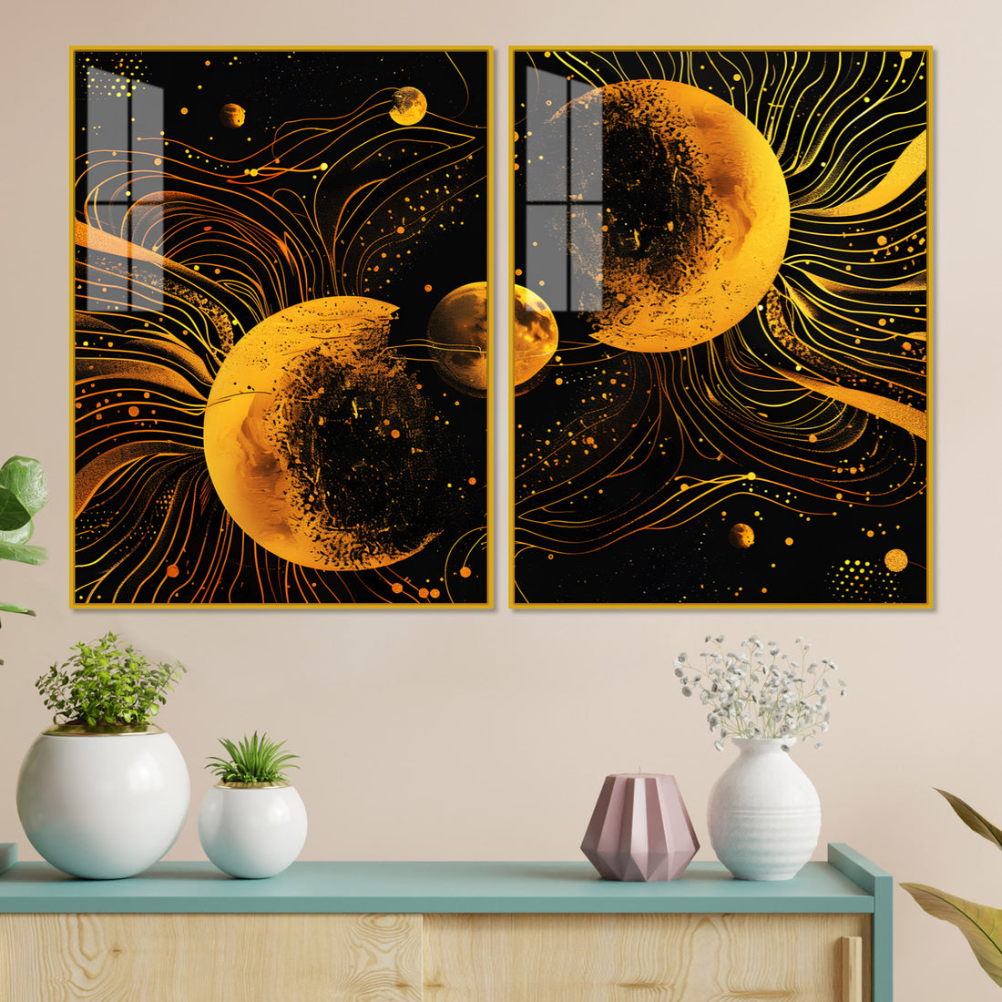 Cosmic Abstract Lunar Symphony in Space Acrylic Floating Wall Painting Set of 2