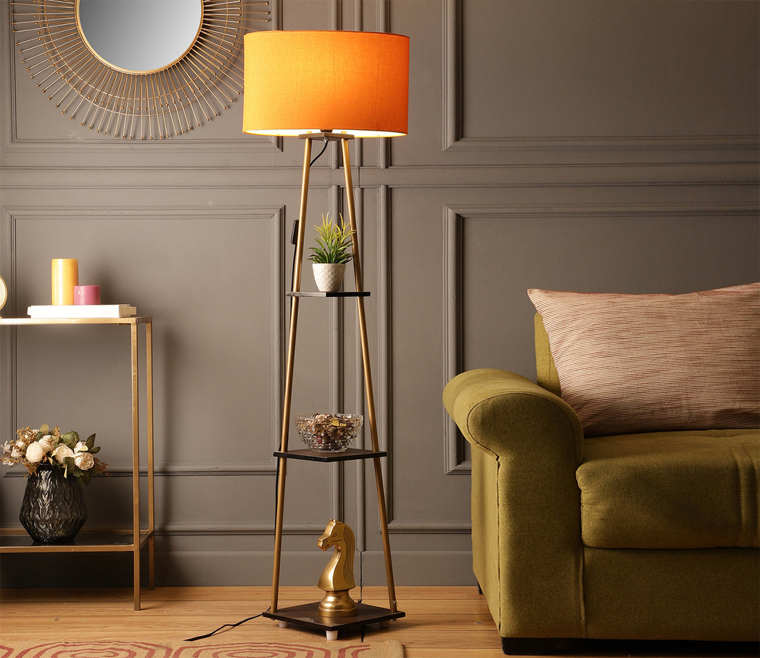 Castle 3 Tier Orange Color Shelf Storage Floor Lamp with Golden Metal Legs