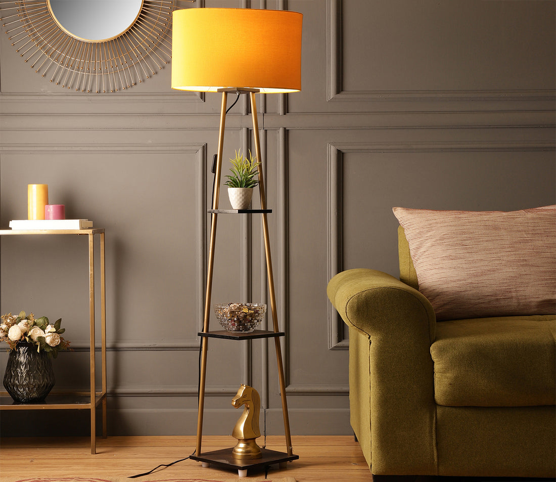 Castle 3 Tier Yellow Color Shelf Storage Floor Lamp with Golden Metal Legs