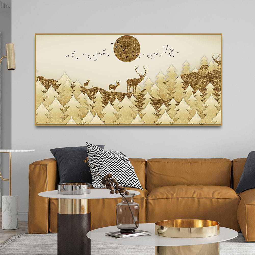 Premium Canvas Wall Painting of Golden Birds Flying over The Dark Forest