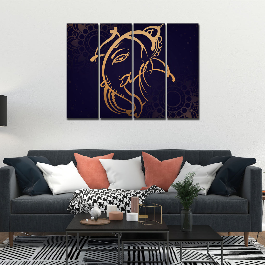 Auspicious Lord Ganesha Head Canvas Wall Painting of 4 Pieces