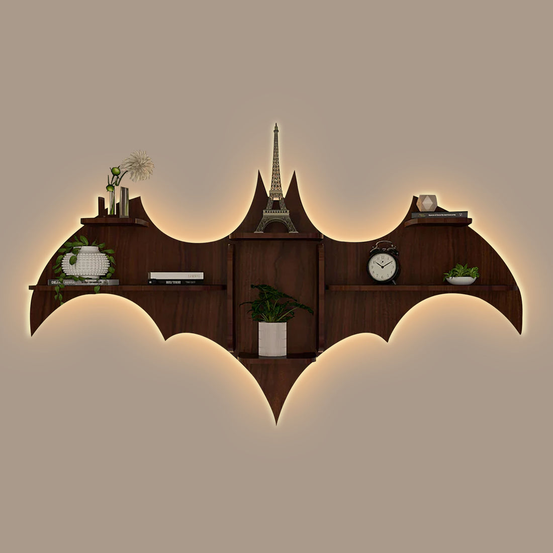 Bat Shape Backlit Designer Wooden Wall Shelf Book Shelf Night Light, Walnut Finish