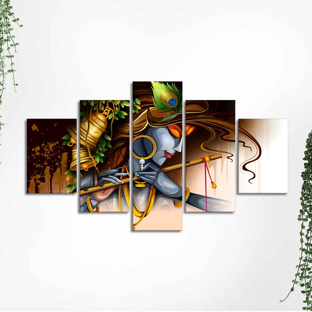 A Beautiful 5 Pieces Wall Painting of Lord Krishna Playing Bansuri