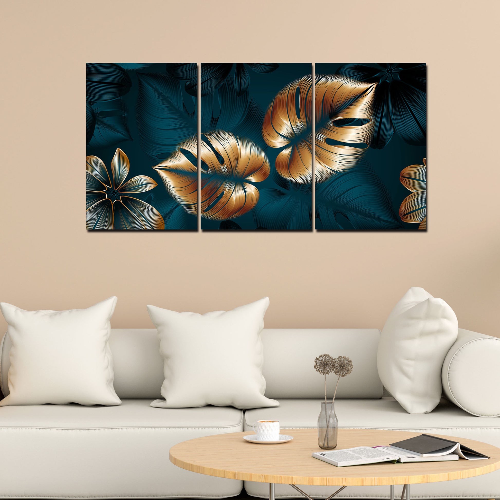 Beautiful Flower & Monstera Leaves Wall Painting of 3 Pieces