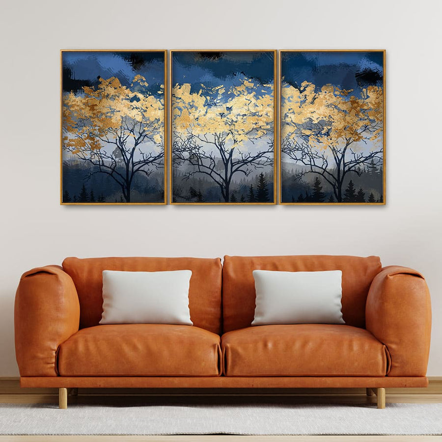 Beautiful Golden Tree Abstract Design Premium Floating Canvas Wall Painting Set of Three