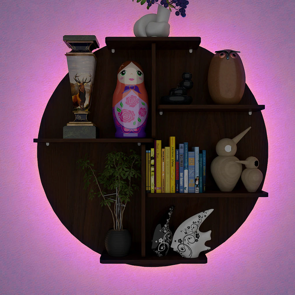 Circle Shape Dark Backlit Designer Wooden Wall Shelf / Book Shelf / Night Light, Walnut Finish