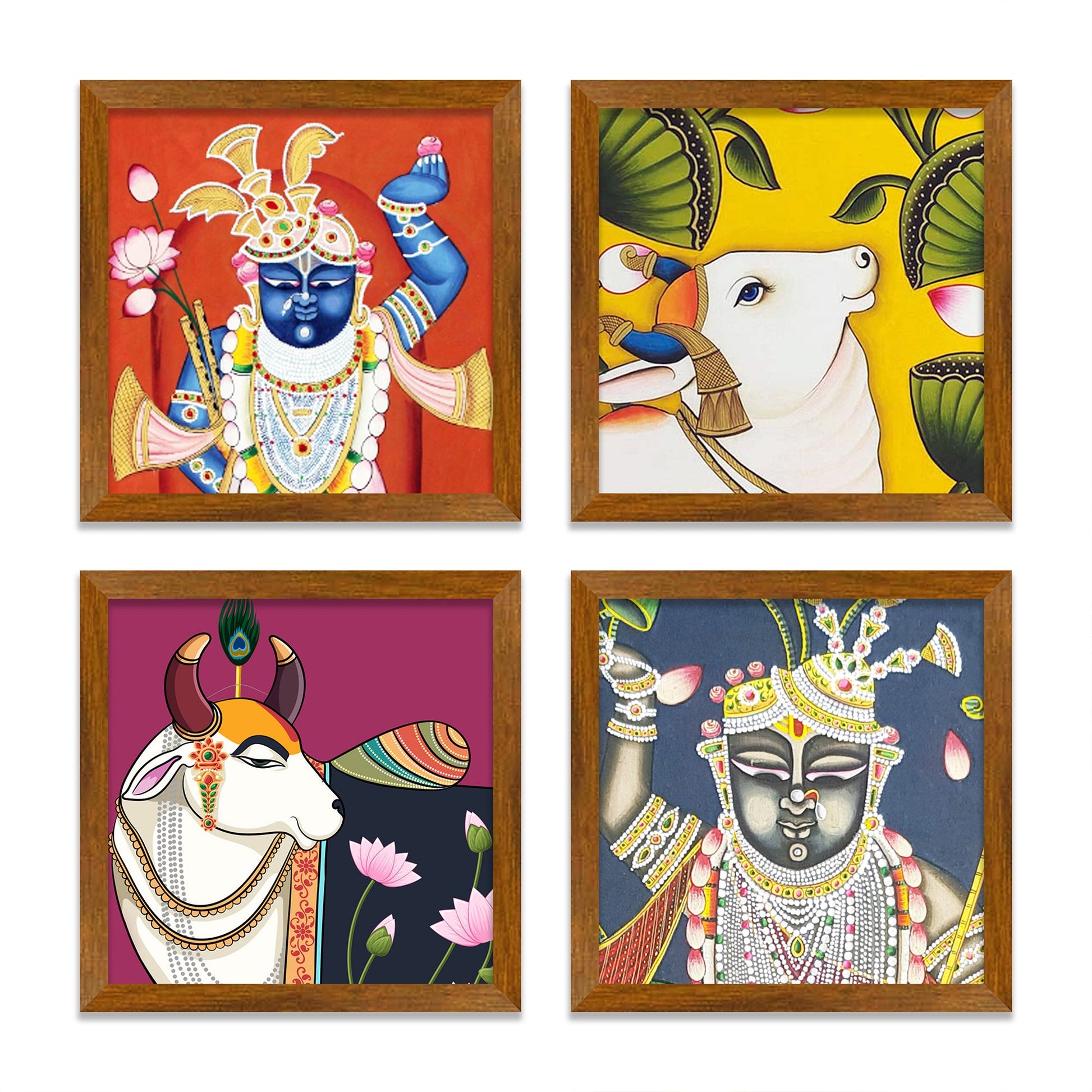 Devine Shrinathji Pichwai Cow Wooden Wall Frame Set of Four