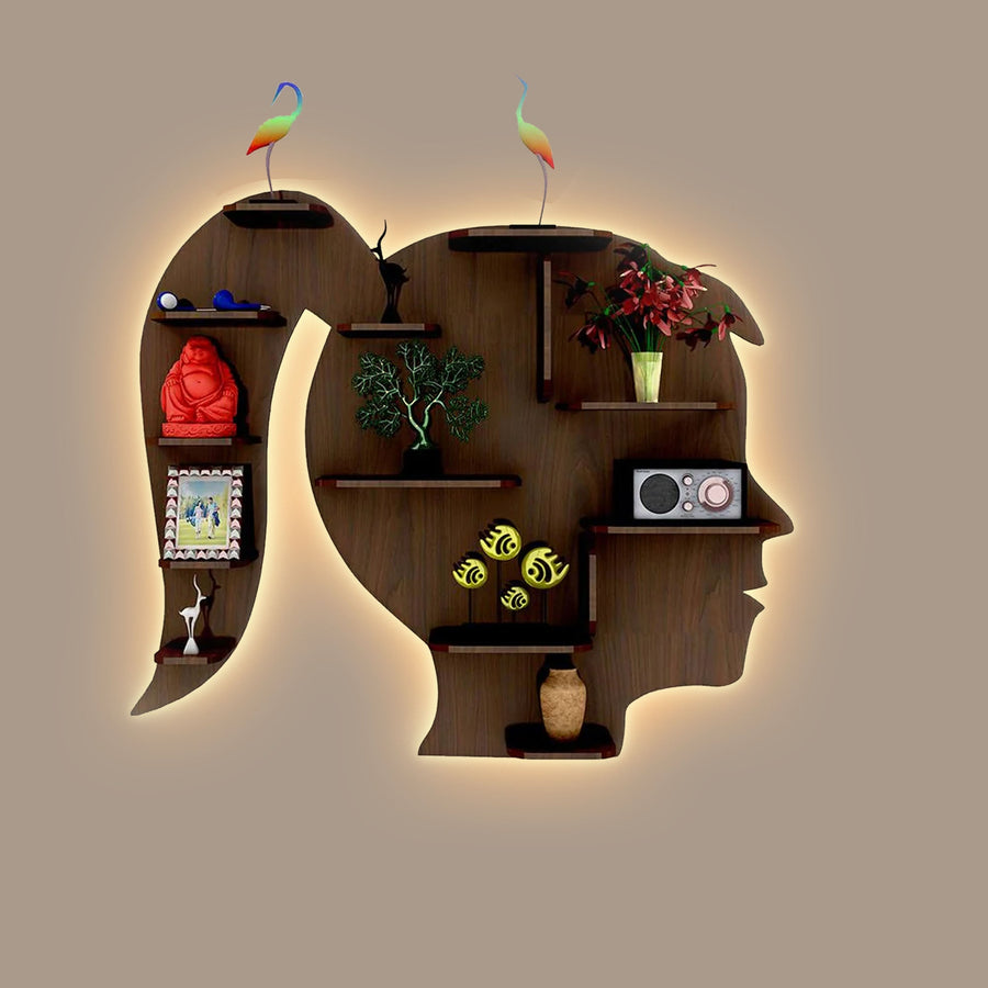 Girl Backlit Designer Wooden Wall Shelf / Book Shelf / Night Light, Walnut Finish