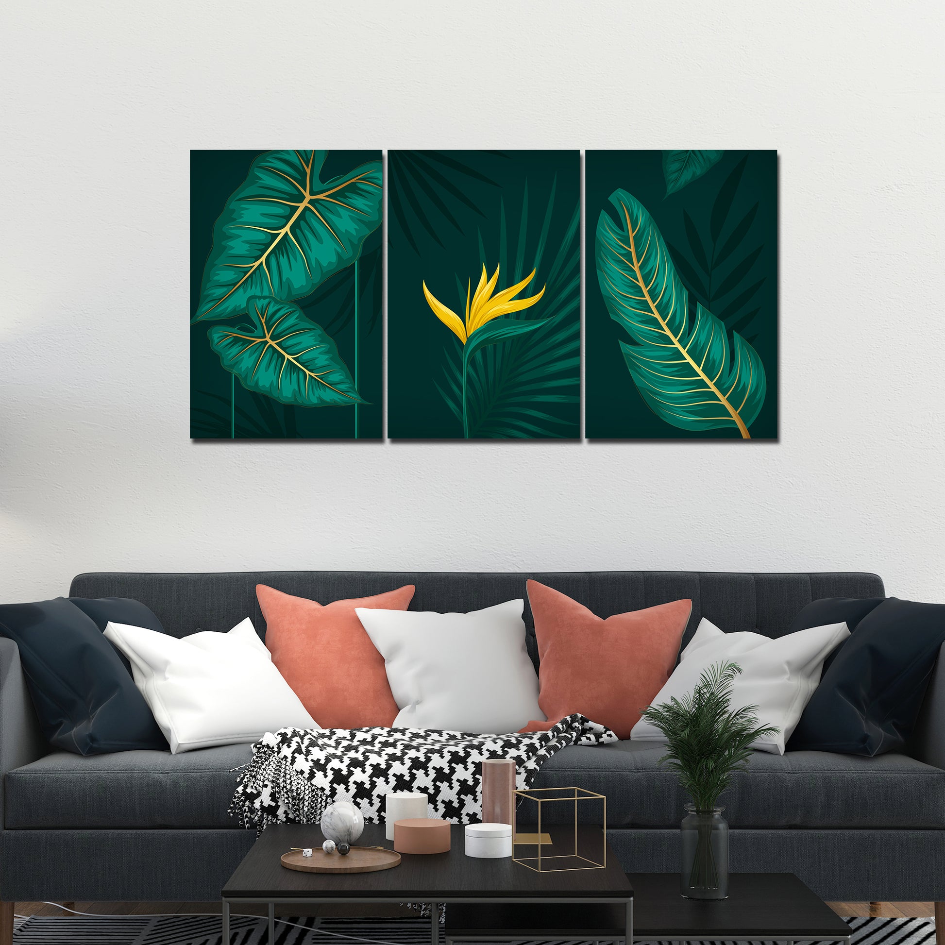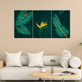Golden Botanical Leaves and Flower Wall Painting of 3 Pieces