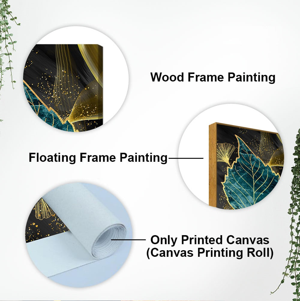 Golden Waves Shapes Turquoise and Green Leaf Feather Canvas Wall Painting