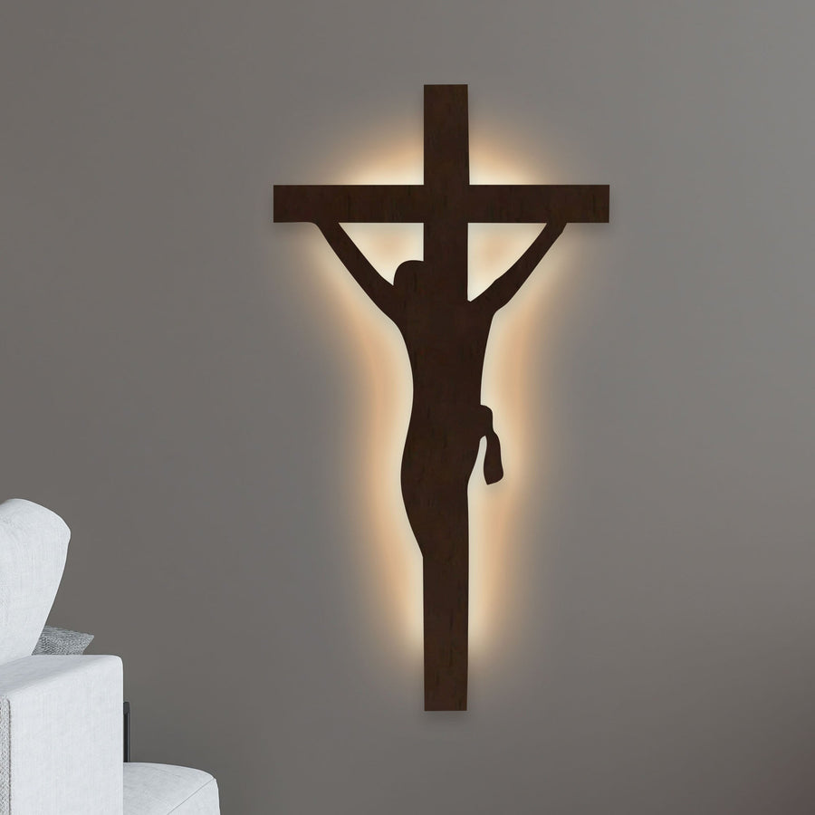 Jesus Crosses Backlit Wooden Wall Hanging with LED Night Light Walnut Finish