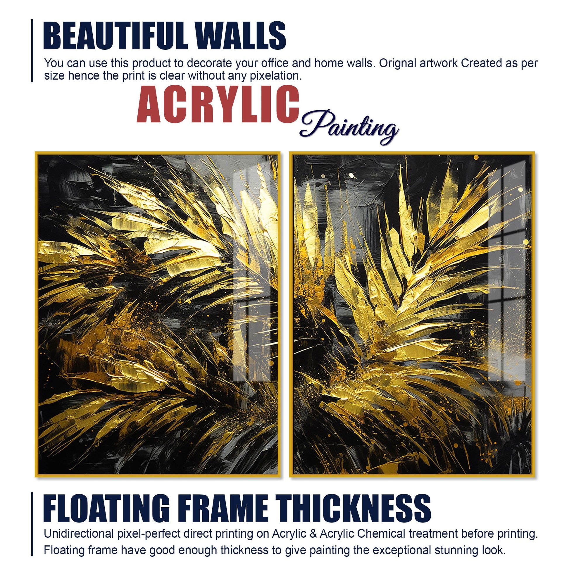 Premium Black and Shiny Gold Palm Leaves Acrylic Floating Wall Painting Set Of 2