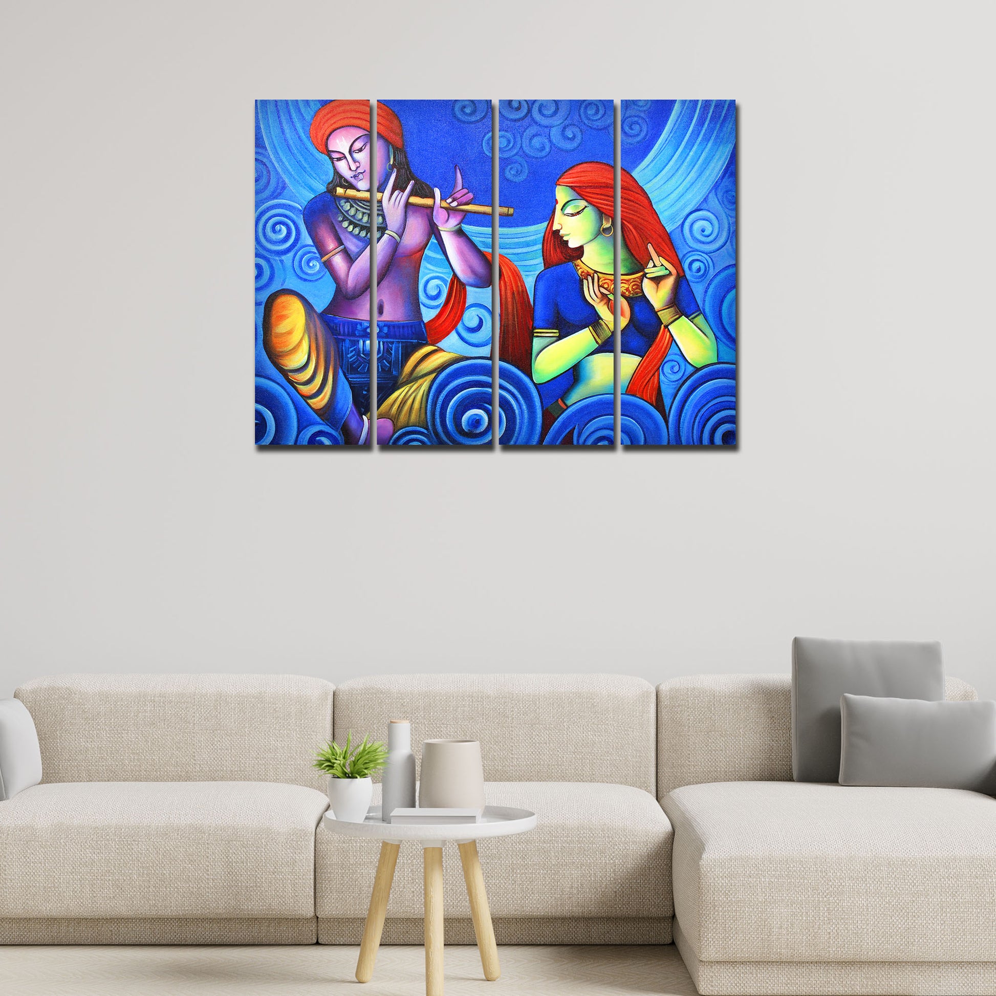 Shree Radha Krishna Flute Canvas Wall Painting 4 Panel Set