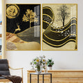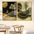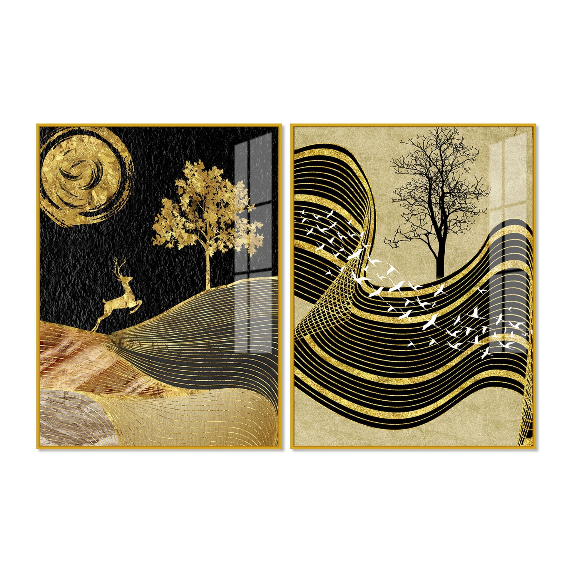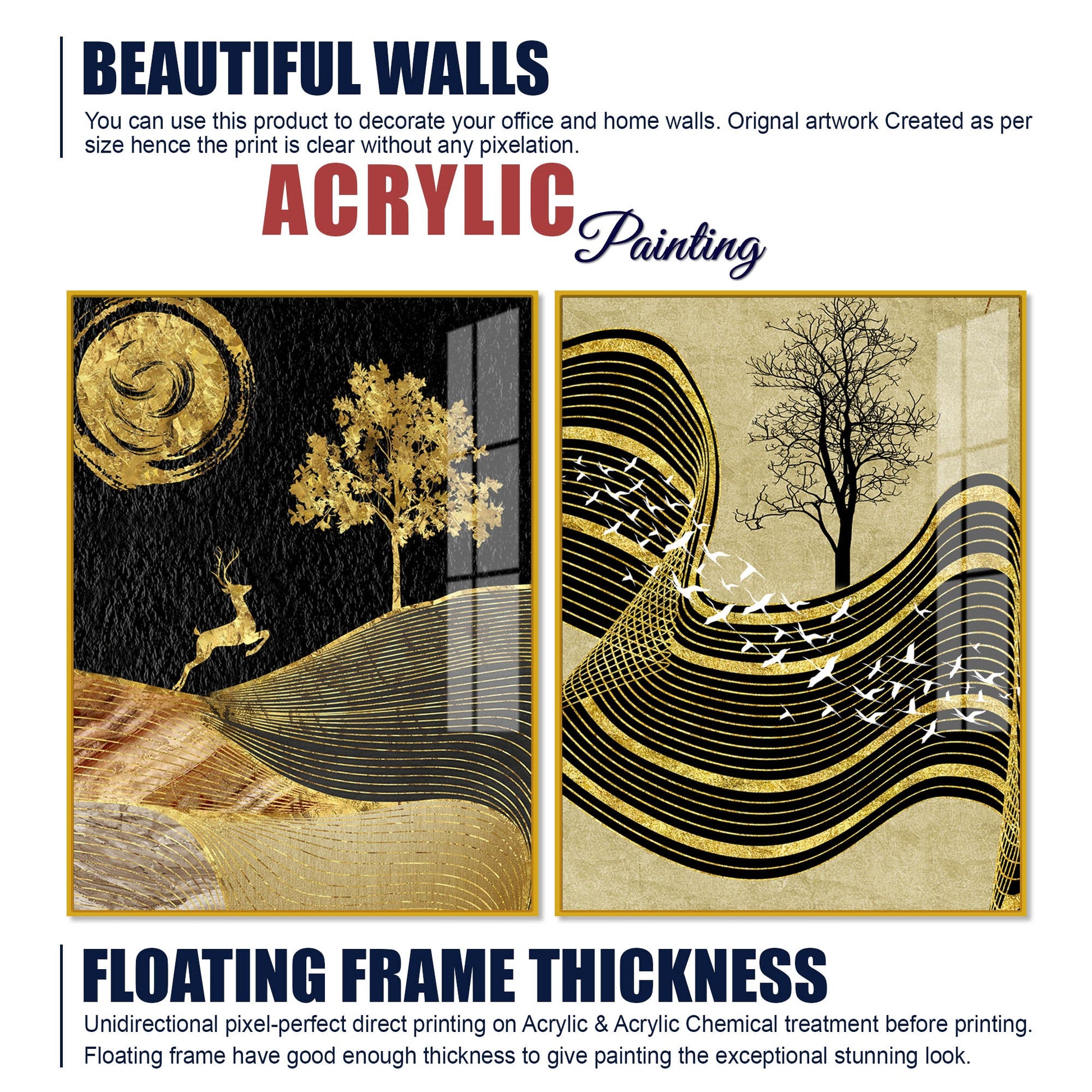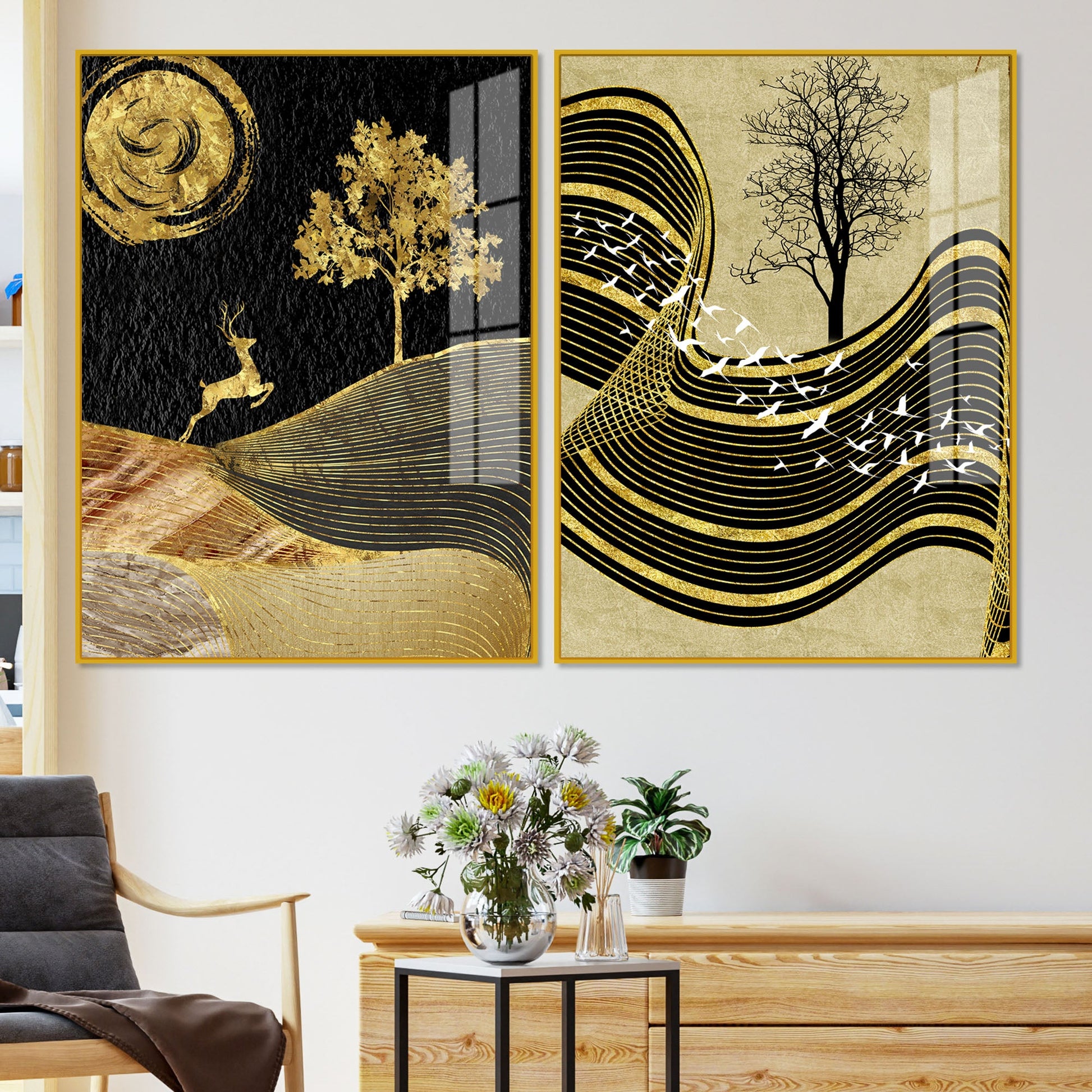 Wavy Golden Lines Mountains Premium Acrylic Floating Wall Painting Set Of 2